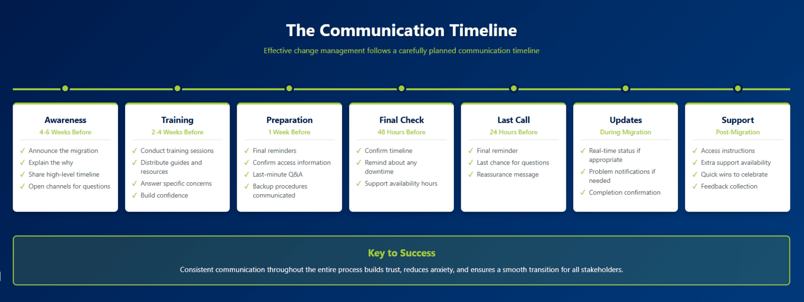 Here's where most migrations fail. The technical team executes perfectly, but nobody told the users what was happening, why it matters, or how to use the new system.