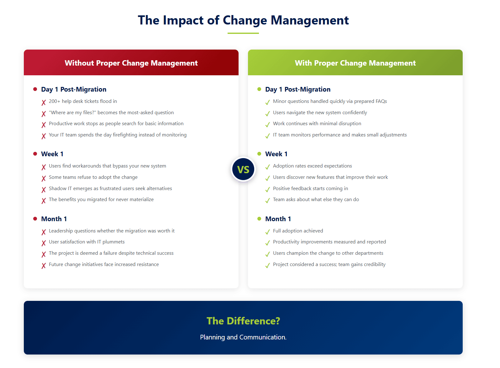 When change management isn't done properly, the user experience is terrible. People can't find their files. Productivity tanks. Your help desk gets overwhelmed. And worst of all—your team resents the change instead of embracing it.