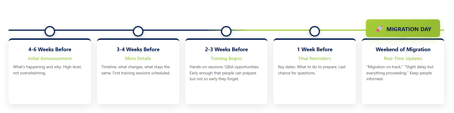Your server can handle the migration perfectly. Your data can transfer without a single error. But if your people don't know what's happening, when it's happening, or how to work in the new environment, your migration fails anyway.