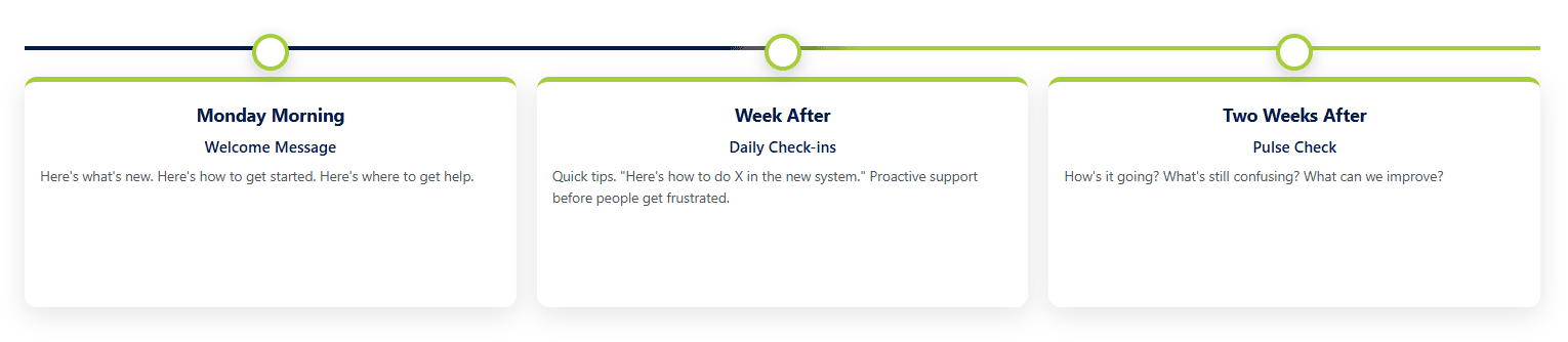 What will the new environment look like? Show them. Screenshots. Videos. Anything that reduces the "wait, is this right?" moment on go-live day. Point out what's different AND what stays the same (because familiar things reduce anxiety).