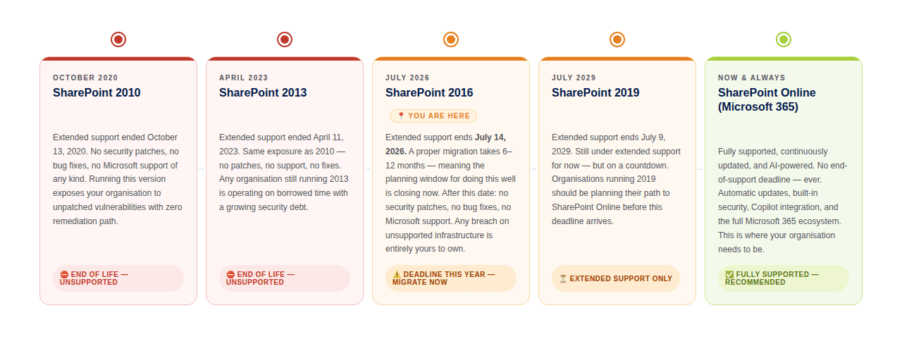 After July 14, 2026, Microsoft will no longer release security updates for SharePoint Server 2016 or 2019. They won't fix bugs. They won't patch vulnerabilities. If a cyber threat specifically targets your version of SharePoint, Microsoft will not respond. You're on your own.