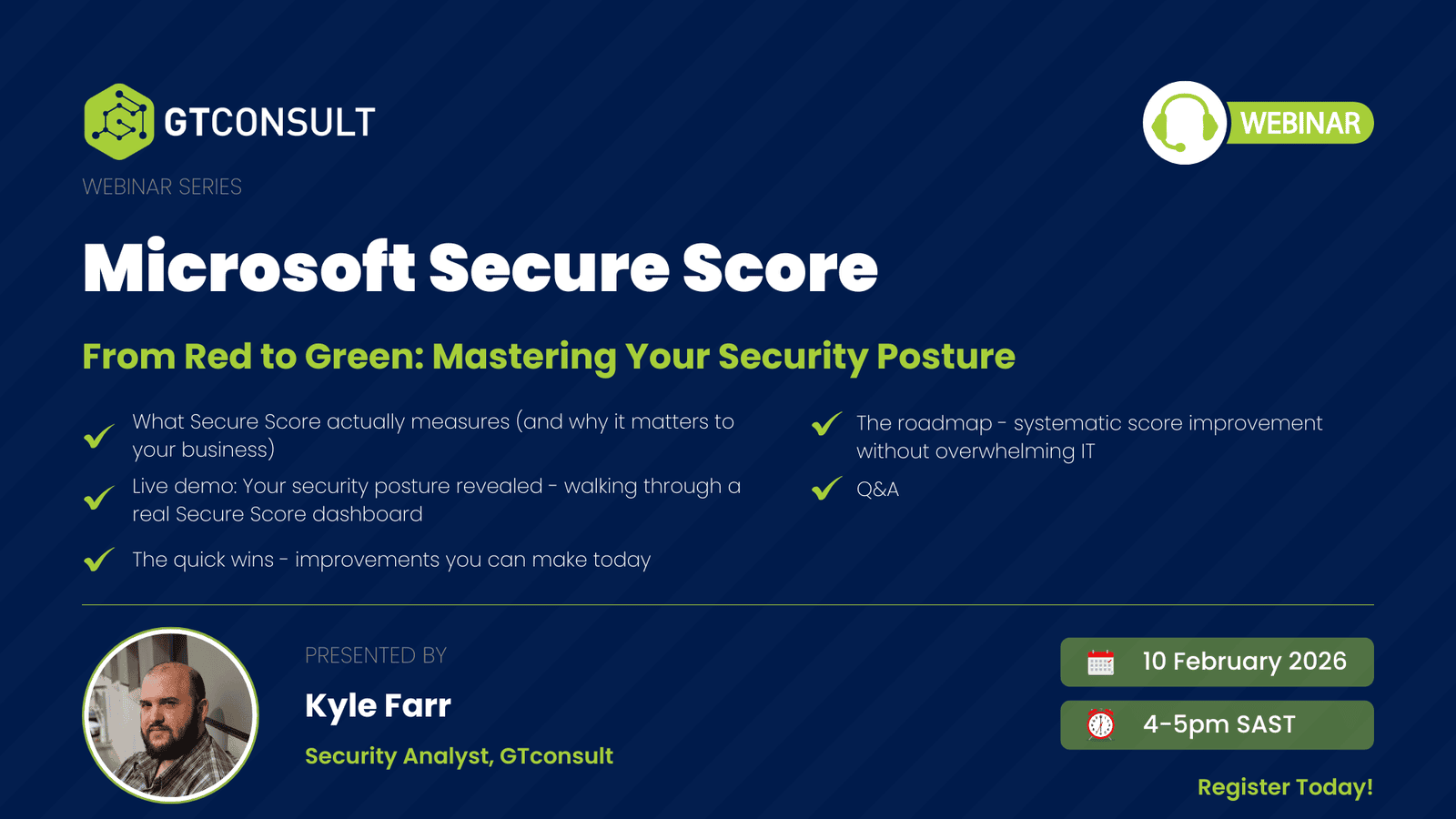 Most IT teams check their Secure Score, feel stressed, and move on. This session changes that. Join Kyle Farr for a live walkthrough of a real Secure Score dashboard, learn which improvements deliver the most impact with the least disruption, and leave with a practical roadmap for meaningful security progress—without overwhelming your team.